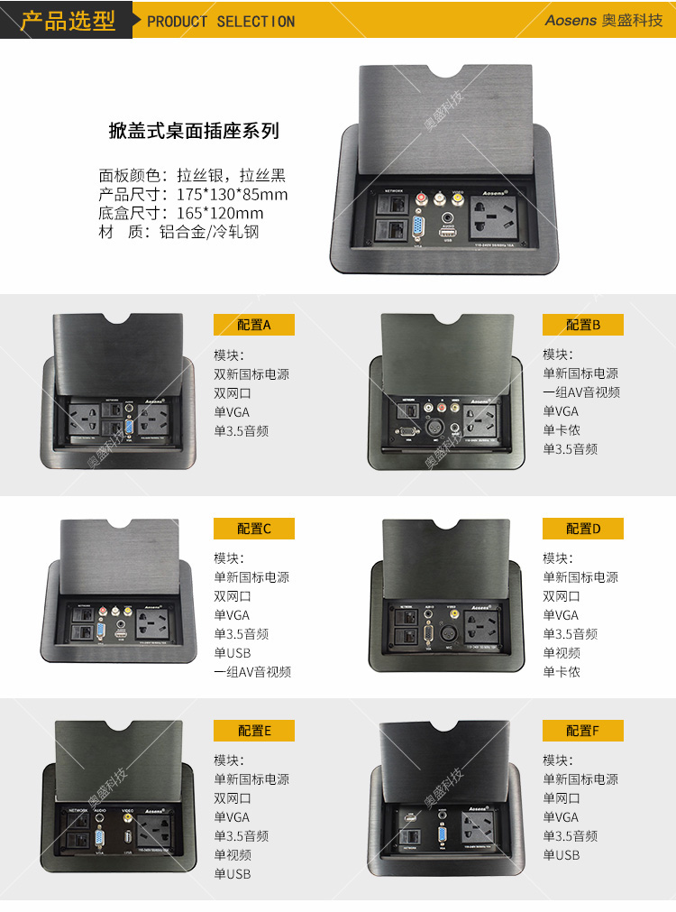 Aosens奧盛 滑蓋式隱藏式桌面插座多媒體桌插 五孔電