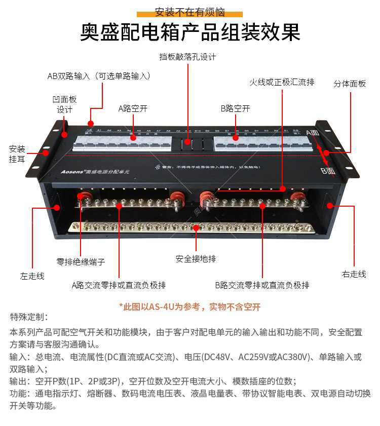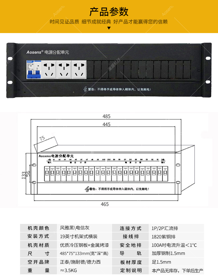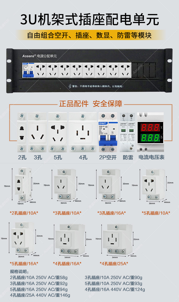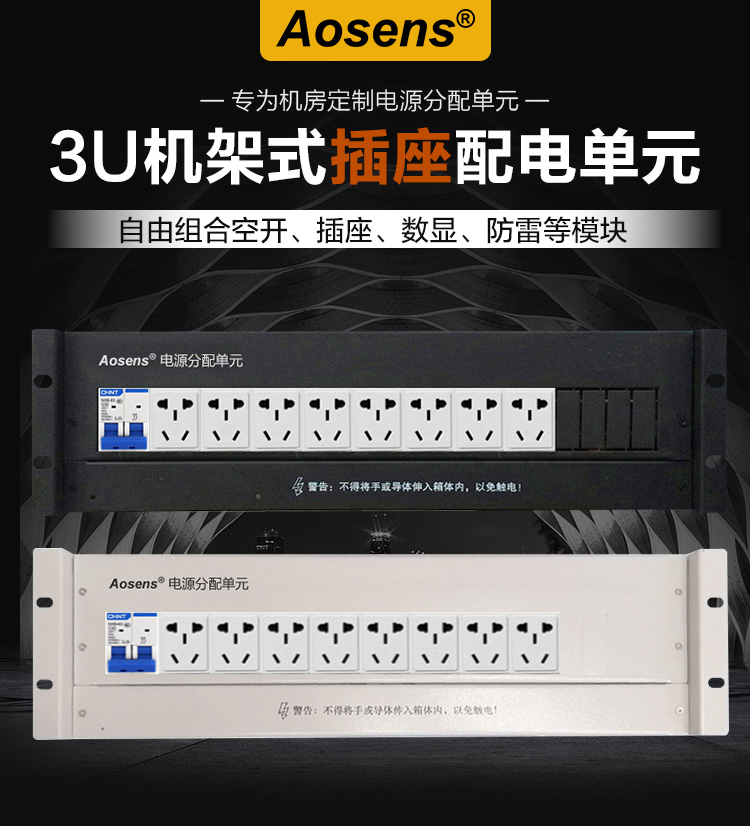Aosens奧盛 19英寸機架式配電單元配正泰2P空開導軌式模數插座五孔電信灰