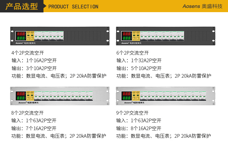 Aosens奧盛機柜配電單元 2U配電箱機架式交流2P空開電流電壓表防雷單路
