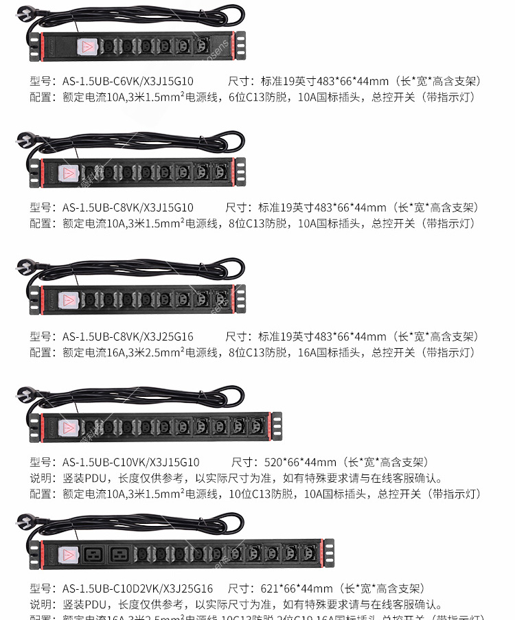 Aosens奧盛 10A6位帶開關PDU電源插座AS-1U-H6S
