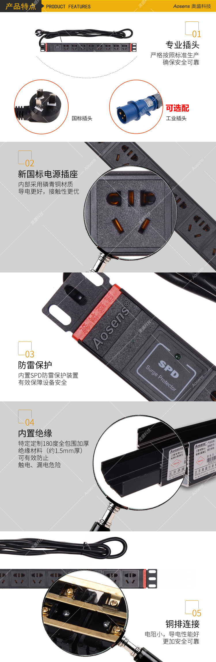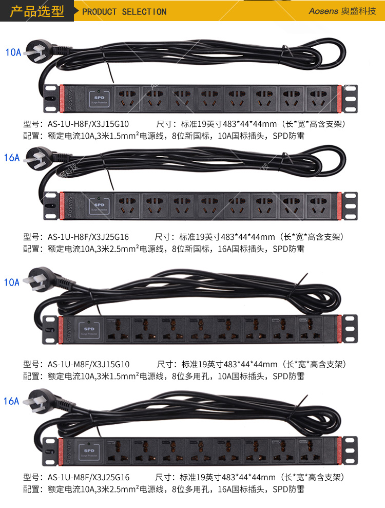 Aosens奧盛 10A8位帶SPD防雷浪涌保護PDU電源插座 16A機柜