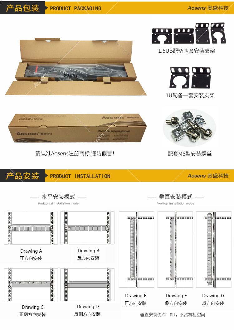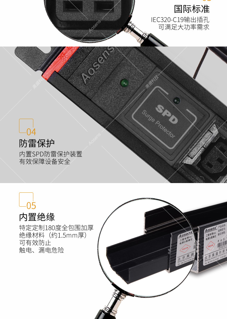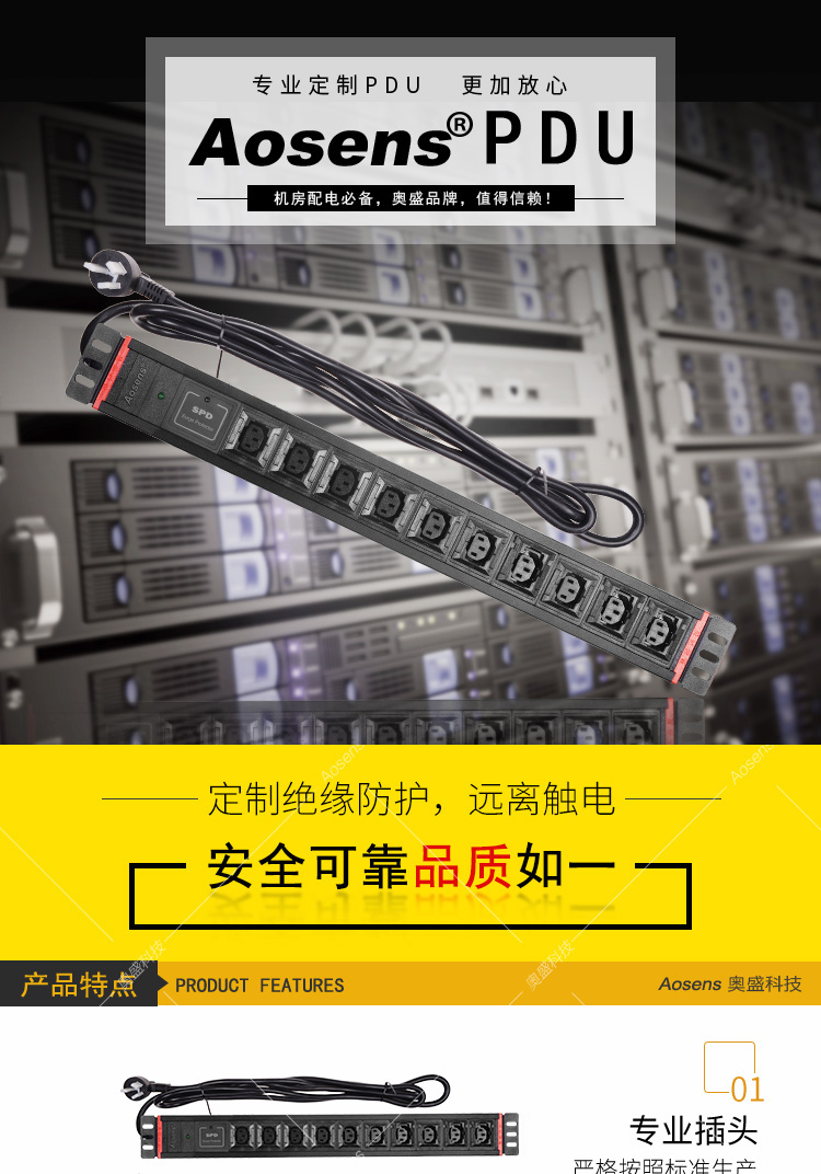Aosens奧盛 16A24位C13防脫C19插孔PDU機柜電源插座 SPD防雷 電源指示燈 AS-1.5UB-C14D10VKS
