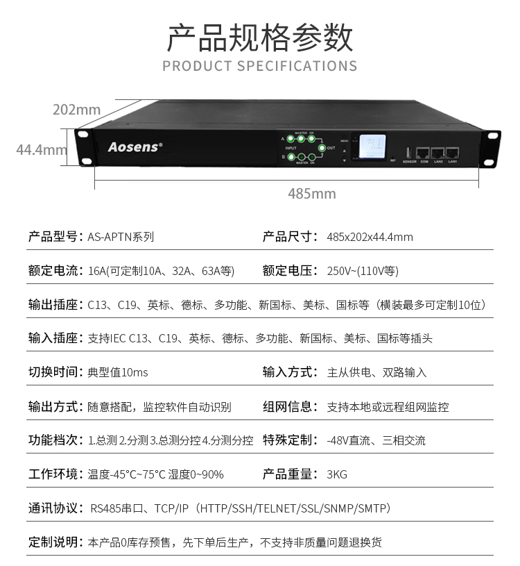 定制10A奧盛(Aosens)STS雙電源切換器靜態(tài)切換開關(guān)RS485智