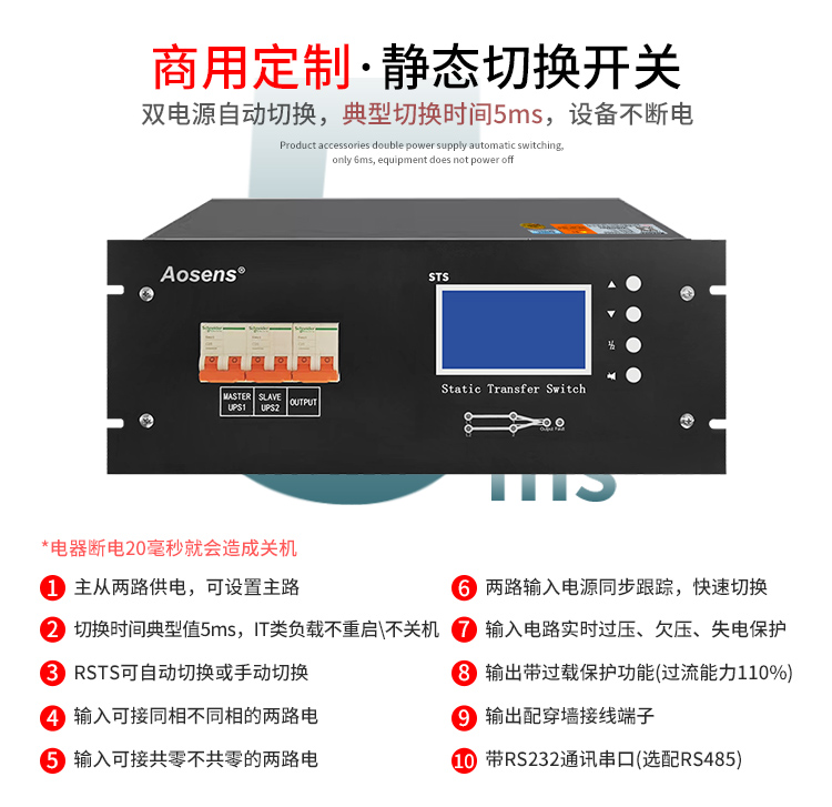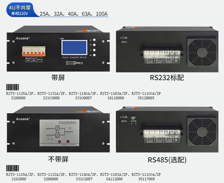 Aosens奧盛 AS-RSTS系列單相25A-100A共零和不共零機架式 5ms雙電源切換器 AS-RSTS-1163/2P
