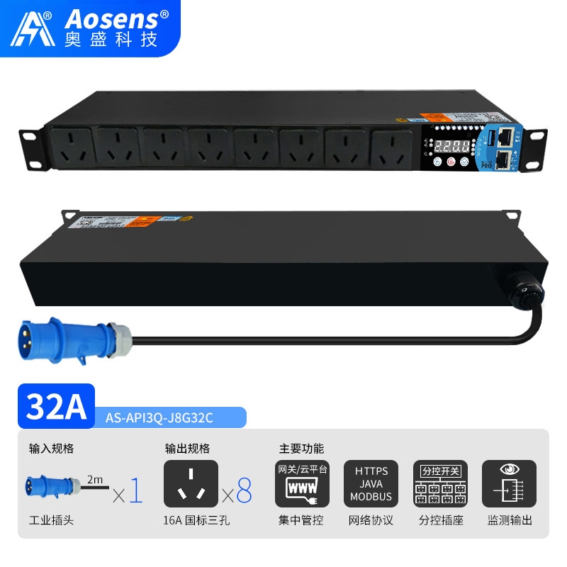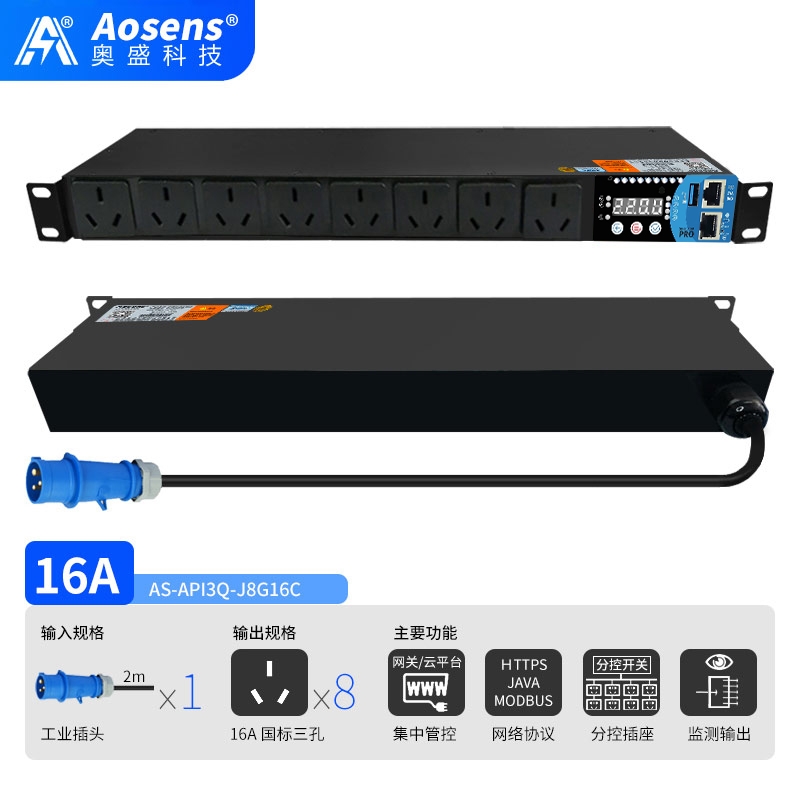 奧盛(Aosens)API3Q網絡遠程監(jiān)控國標三孔PDU電源插座智能時序控制定時物聯網SNMP協議MODBUS