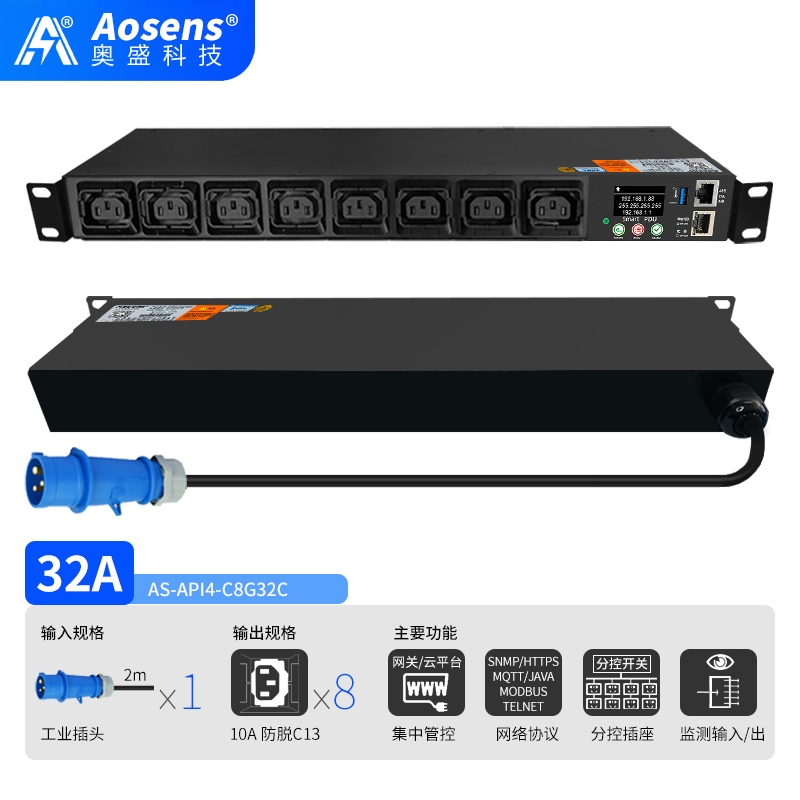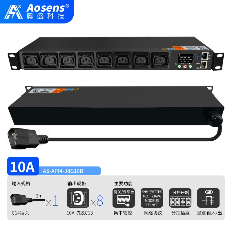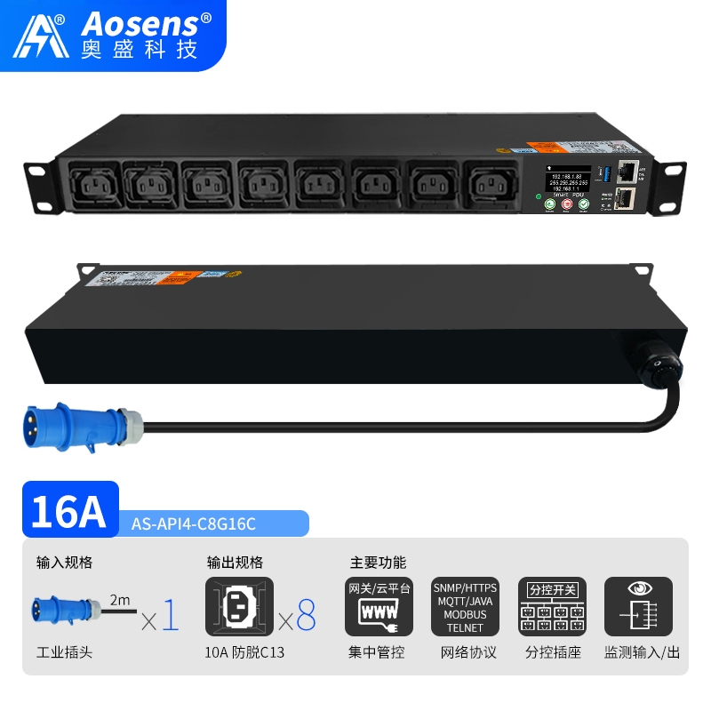 奧盛(Aosens)API4網絡遠程監控C13防脫PDU電源插座智能時序控制定時物聯網SNMP協議MODBUS