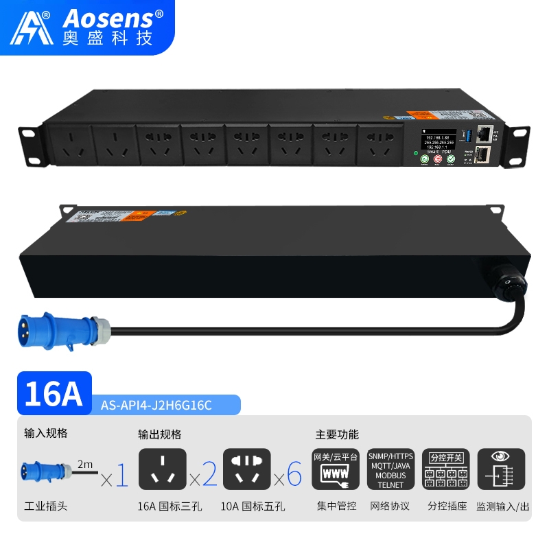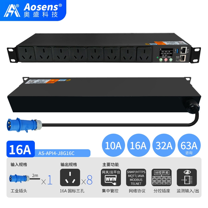 奧盛(Aosens)API4網絡遠程監控國標三孔PDU電源插座智能時序控制定時物聯網SNMP協議MODBUS