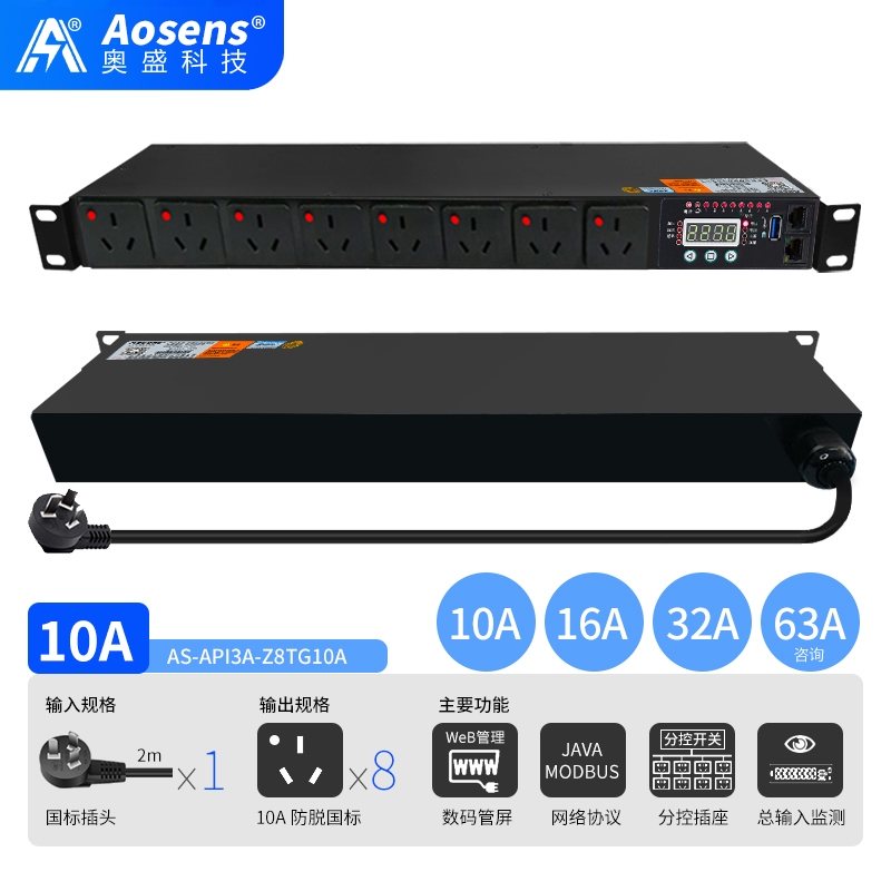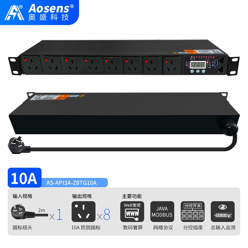 奧盛(Aosens)API3A網絡遠程監控三孔防脫PDU電源插座智能時序控制定時開關HTTP協議MODBUS