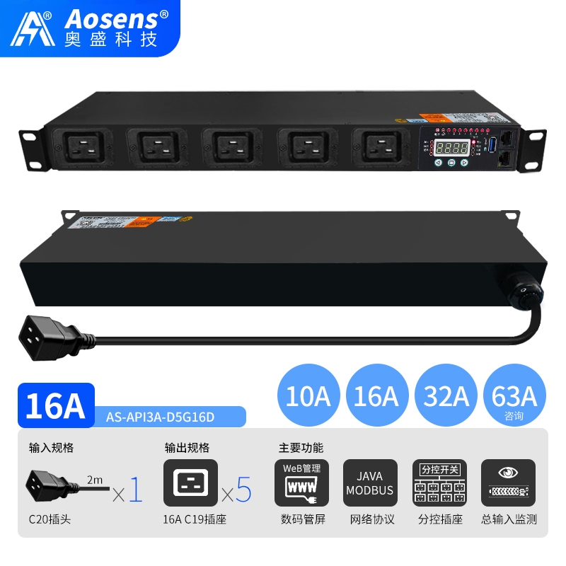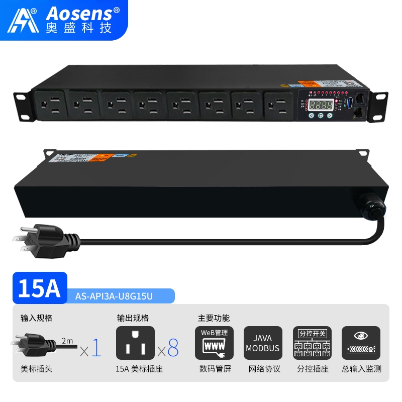 奧盛(Aosens)API3A網絡遠程監控C19 PDU電源插座美標智能時序控制定時開關HTTP協議MODBUS協