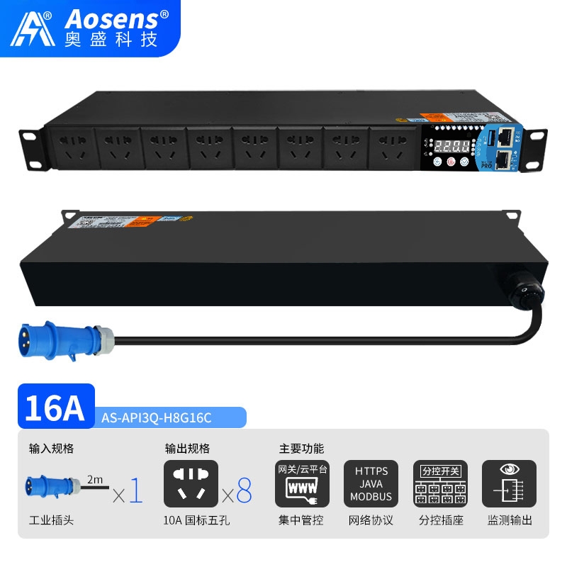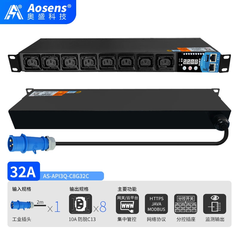 奧盛(Aosens)API3Q網絡遠程監控C13防脫PDU電源插座智能時序控制定時物聯網SNMP協議MODBUS