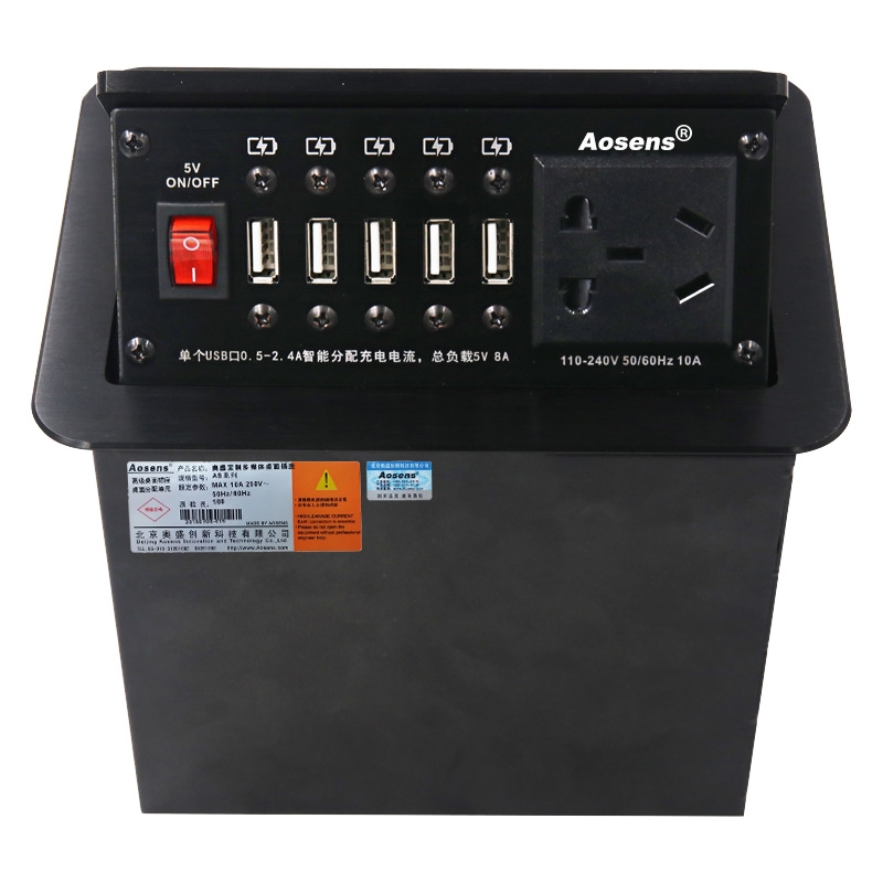 Aosens奧盛 氣撐彈起式氣壓氣動多媒體免焊桌面插座 五孔電源 USB開關 5個智能充電USB AS-ZH-307N
