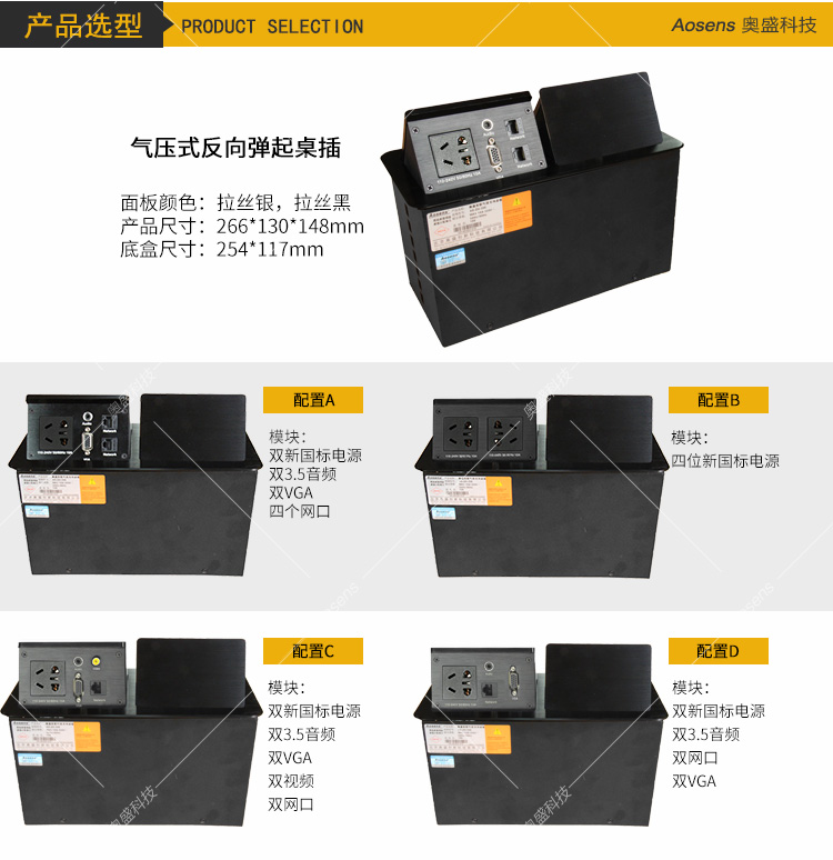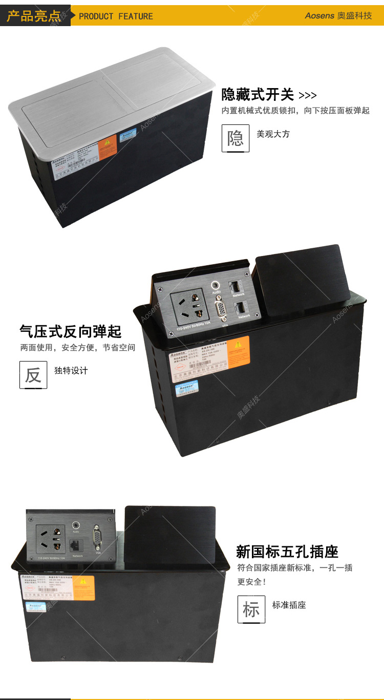 Aosens奧盛 多功能氣撐桌面插座 反向彈起多媒體會議桌信息插 五孔電源 3.5音頻 雙網絡 AS-ZH-304A