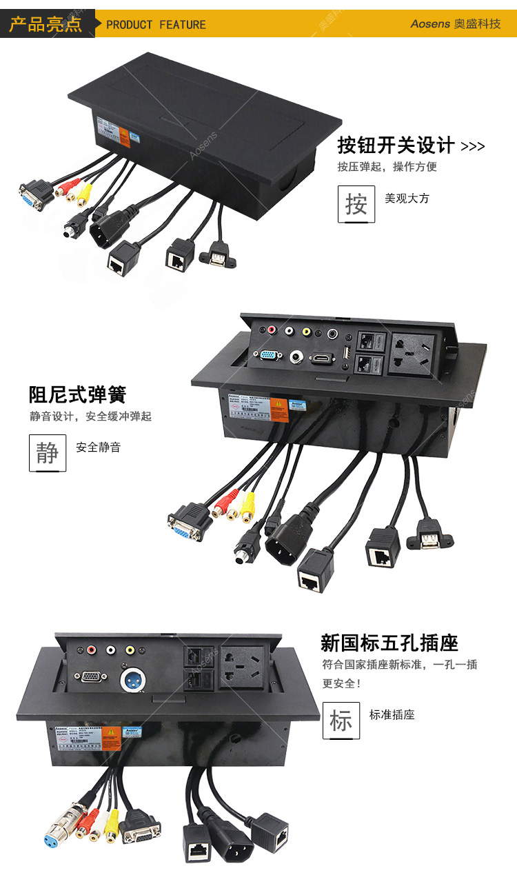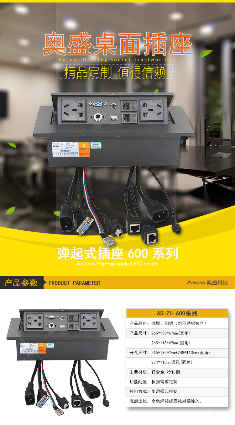 Aosens奧盛 氣撐彈起式氣壓氣動多媒體免焊桌面插座
